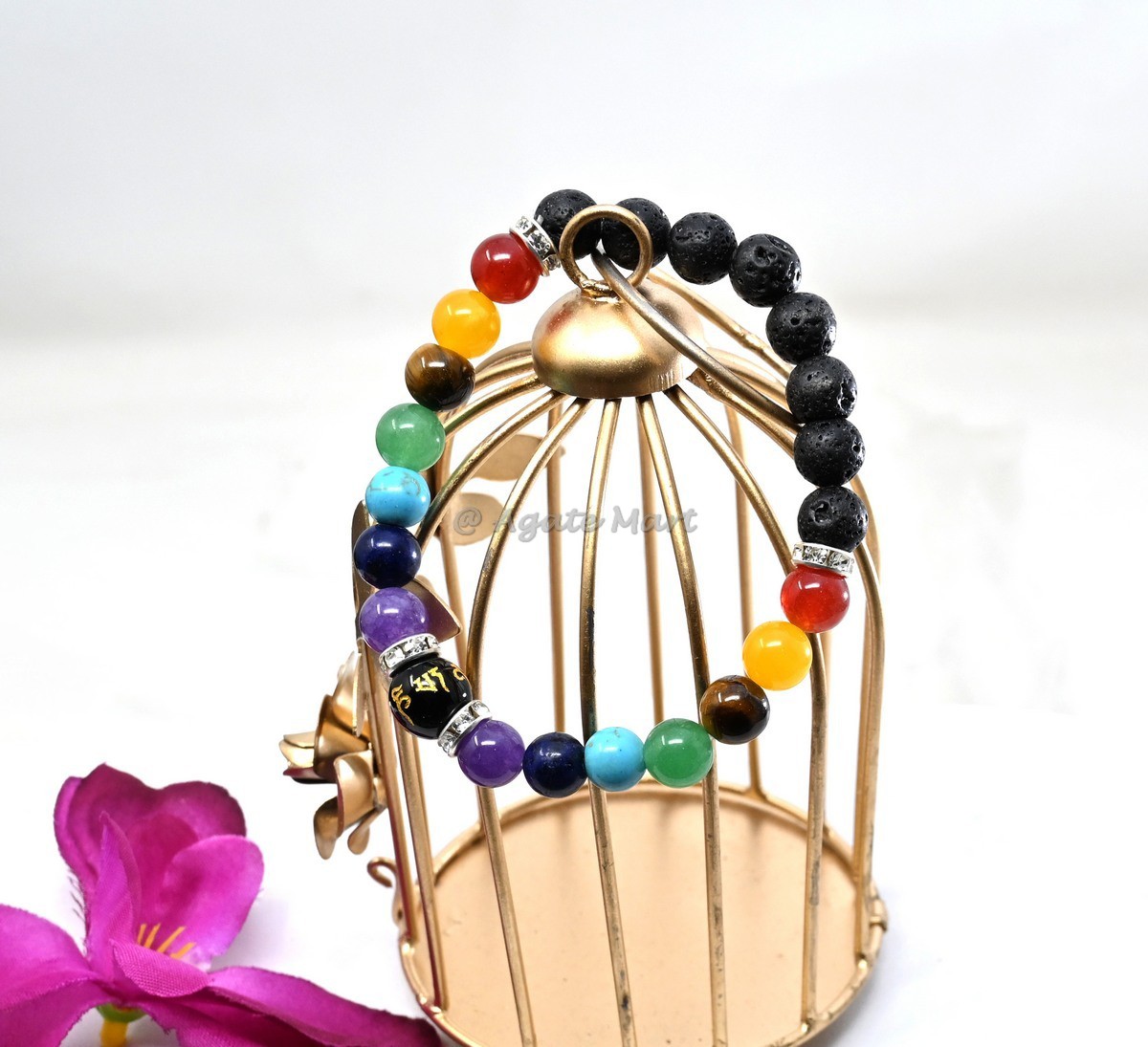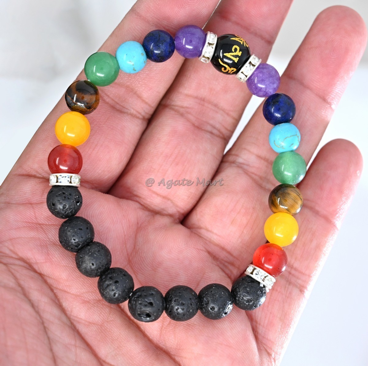 Achieve holistic healing with our 7 Chakra With Lava Stone And Home Mani Bracelet. This unique bracelet combines the balancing properties of chakra stones with the grounding energy of lava stone. Each stone is carefully selected to ensure maximum effectiveness, helping to align and balance your chakras. Lava stone is known for its grounding properties, making it an ideal choice for those seeking to connect with the earth`s energy. This bracelet is perfect for those looking to enhance their spiritual and emotional well-being. Ideal for wholesale buyers looking for high-quality, unique chakra jewelry, this bracelet is a standout piece that offers both beauty and functionality. Available in bulk for great savings, making it an excellent choice for retailers and resellers. Order now from Agate Mart and experience the benefits of holistic healing with this beautiful chakra and lava stone bracelet.