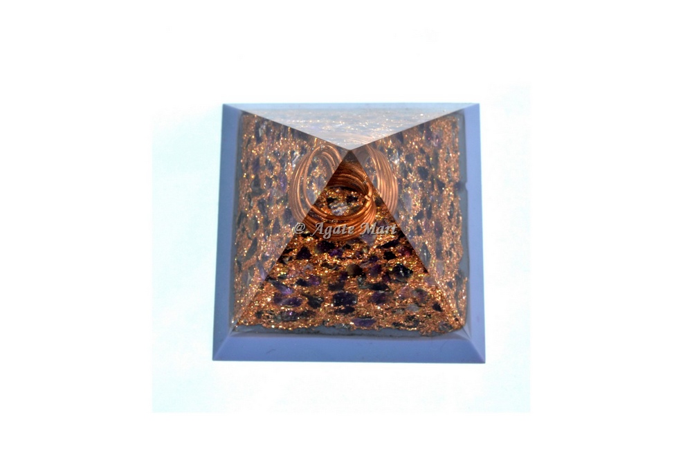 Shop for Amethyst With Copper Orgonite Crystal Pyramids today from Agate Mart. Orgonite pyramid helps to filter and balance energy fields in our environment and can aid in strengthening your energy body by converting low frequency energy into a higher frequency that is more beneficial for life forms including yourself, pets and plants. Amethyst is a natural tranquiliser, it relieves stress and strain, soothes irritability, balances mood swings, dispels anger, rage, fear and anxiety. Alleviates sadness and grief, and dissolves negativity. Amethyst activates spiritual awareness, opens intuition and enhances psychic abilities. Orgone pyramids are made of a mix of organic (resin) and non-organic materials (metal shavings) that have the property of moving the orgone energy back and forth and act as a cleansing of the stagnant, negative energies.