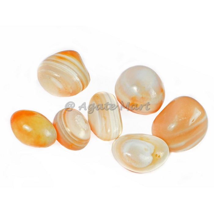 These Banded Stones Tumbled Stones, often called the earth rainbow, Banded it is a healing stone for body, mind and spirit. It can increase concentration, honesty and memory. It also protects the wearer from psychic attack, thereby preventing negative energy from harming you. Agate is beneficial in self-analysis and uncovering hidden circumstances that might interfere with well-being. It promotes self-acceptance and confidence, encouraging the speaking of one`s own truth. Agate overcomes negativity and bitterness of the heart, by healing anger, fostering love, and lending the courage to start over. It is useful for any kind of trauma. Physically, it increases stamina, helps with digestive conditions and protects the body from harmful radiation from X-Rays. It promotes inner stability, composure, and maturity. Its warm, protective properties encourage security and self-confidence. It is a great crystal to use during pregnancy. Agate also helps new mothers avoid the "baby blues" sometimes experienced after giving birth. It stops the burning desires for things we do not need, and assists those juggling commitments or multiple jobs. It helps writers express ideas in marketable form, and helps young children learn to walk and not fall as they get older. It also promotes marital fidelity. It is useful as a protection amulet when traveling, and is especially effective against traffic accidents.