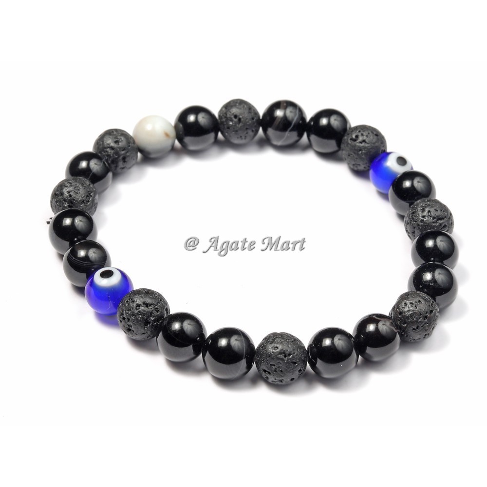 Purchase Black Obsidian And Lava With Blue Third Eye Bracelet from Agate Mart today. The black obsidian is also known as the glass agate, volcanic glass, glassy lava, xaga, and royal agate. It`s born speedily out of fast cooling lava, which flows from a volcano. This is the reason why it has the most powerful energies. Further, it also has the elements of earth, water, and fire. A strongly protective stone, it forms a shield against negativity. It blocks psychic attack and absorbs negative energies from the environment. Obsidian draws out mental stress and tension. Lava Rock is known for being a grounding stone, one that can balance the emotions and bring about calmness and strength. It`s believed to help keep tempers in check and also help its wearer to work through problems in a logical way. When you wear a bracelet, it attract blood towards the arm, since our blood contains iron. Improved circulation leads to better health and quicker recoveries from injuries or accidents. Moreover, enhanced blood flow eliminates toxins from our bodies. This chakra is responsible for the link between your mind and the outer world, embodying your ability to see both the inner and outer worlds. This allows you to experience clear thought and self-reflection.