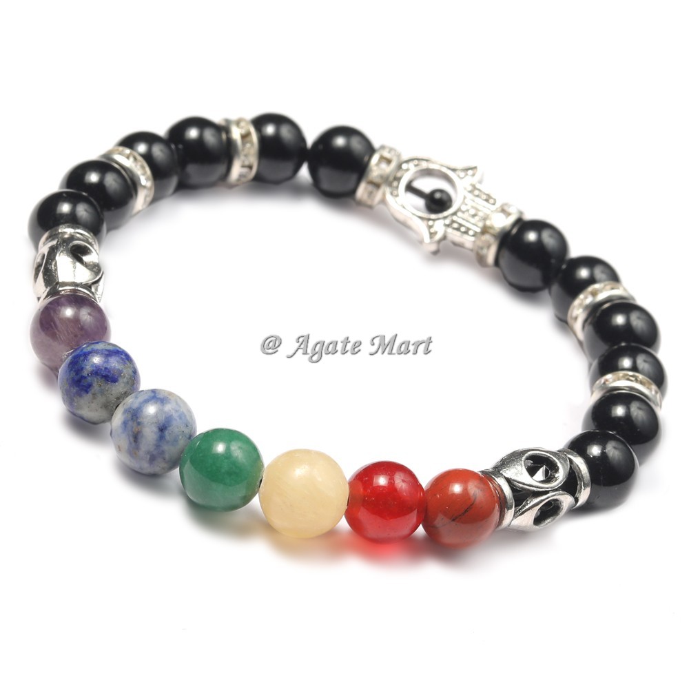 A huge collection of Black Obsidian 7 Chakra Stones With Hamsa Bracelet is here at Agate Mart. The black obsidian is also known as the glass agate, volcanic glass, glassy lava, xaga, and royal agate. It`s born speedily out of fast cooling lava, which flows from a volcano. This is the reason why it has the most powerful energies. Further, it also has the elements of earth, water, and fire. The Hamsa Hand is a sign of protection, thought to bring happiness, luck, good health and fortune. It`s also used to ward off what is often known as ?the evil eye??the cross-religious belief in a cursed stare whose destructive energies encapsulate all the negative energies in the world. When 7 Chakra Bracelets are worn, it helps to keep the seven Chakras at their right energy levels causing the wearer to feel more balanced. The task becomes attainable as it helps to focus on keeping the chakras open and replace negative thoughts with an optimistic outlook towards life.