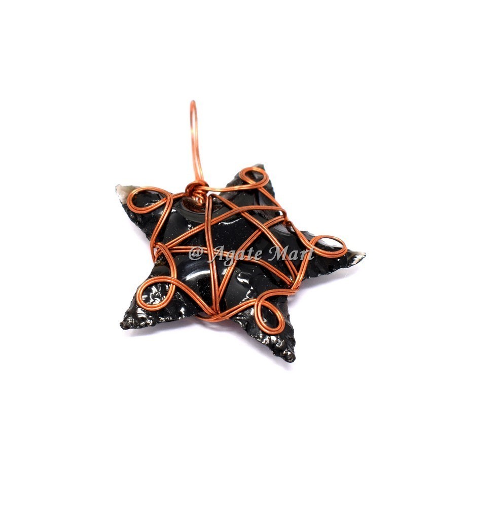 Book an order for Black Obsidian Star Wire Wrap Pendant at Agate Mart. Black Obsidian Stone is a powerful cleanser of psychic smog created within your aura, and is a strong psychic protection stone. This stone has powerful metaphysical properties that will help to shield you against negativity. The energy of these stones may stimulate the gift of prophesy and may boost precognition. Obsidian is a very historical gemstone that has been used as a good luck charm from ancient times. This gemstone is good for people that can be influenced easily or people with sensitive heart. Obsidian can return negative energy to the earth because it has very strong connection with the earth, especially lava.