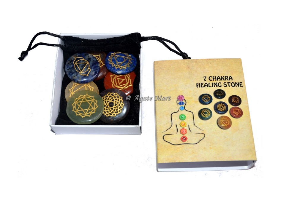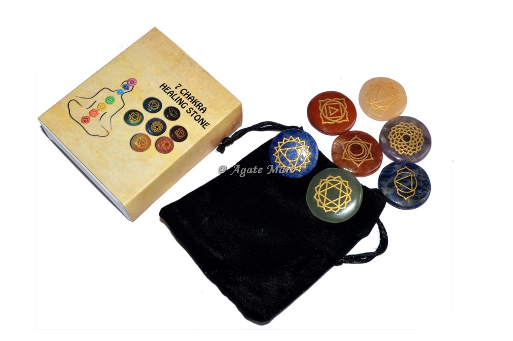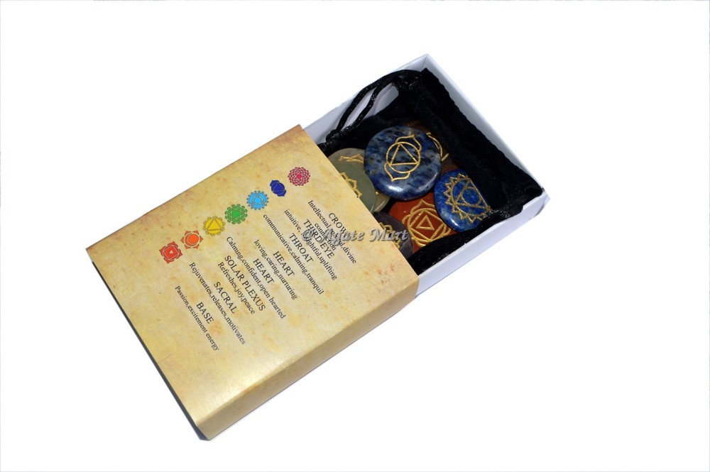 Engraved Seven Chakra Healing Stone With Box to hold all your stones. You can use as Pocket Stones, Worry Stones, Meditation, or for crystal healing and Reiki. Place your order online. Order online for Engraved Seven Chakra Healing Stone With Box to hold all your stones. This set of seven colored agate stones lets you meditate on whatever Chakra you feel needs work. Stones are packaged in an exquisitely designed gift box and come with a Buddha Groove satin pouch for safekeeping. For any special order contact us directly. You can use as Pocket Stones, Worry Stones, Meditation, or for crystal healing and Reiki. Place your order online. Buy this Engraved Seven Chakra Healing Stone With Box as per your customization for logo and design.