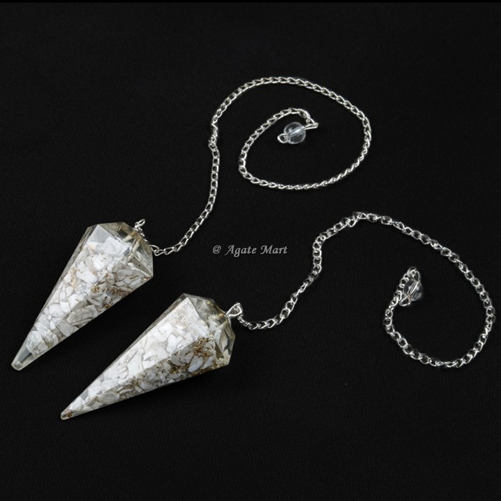 Buy Howlite Orgone Pendulum with Silver Chain online at affordable prices. Howlite strengthens memory and stimulates desire for knowledge. It teaches patience and helps to eliminate rage, pain and stress. A calming stone, Howlite calms communication, facilitates awareness and encourages emotional expression. Howlite balances calcium levels in the body. Orgone Pendulum have been known throughout history for their beauty and healing qualities. Many people believe that each stone emits energy that affect our well-being. For any further customization or change in the design contact us directly.