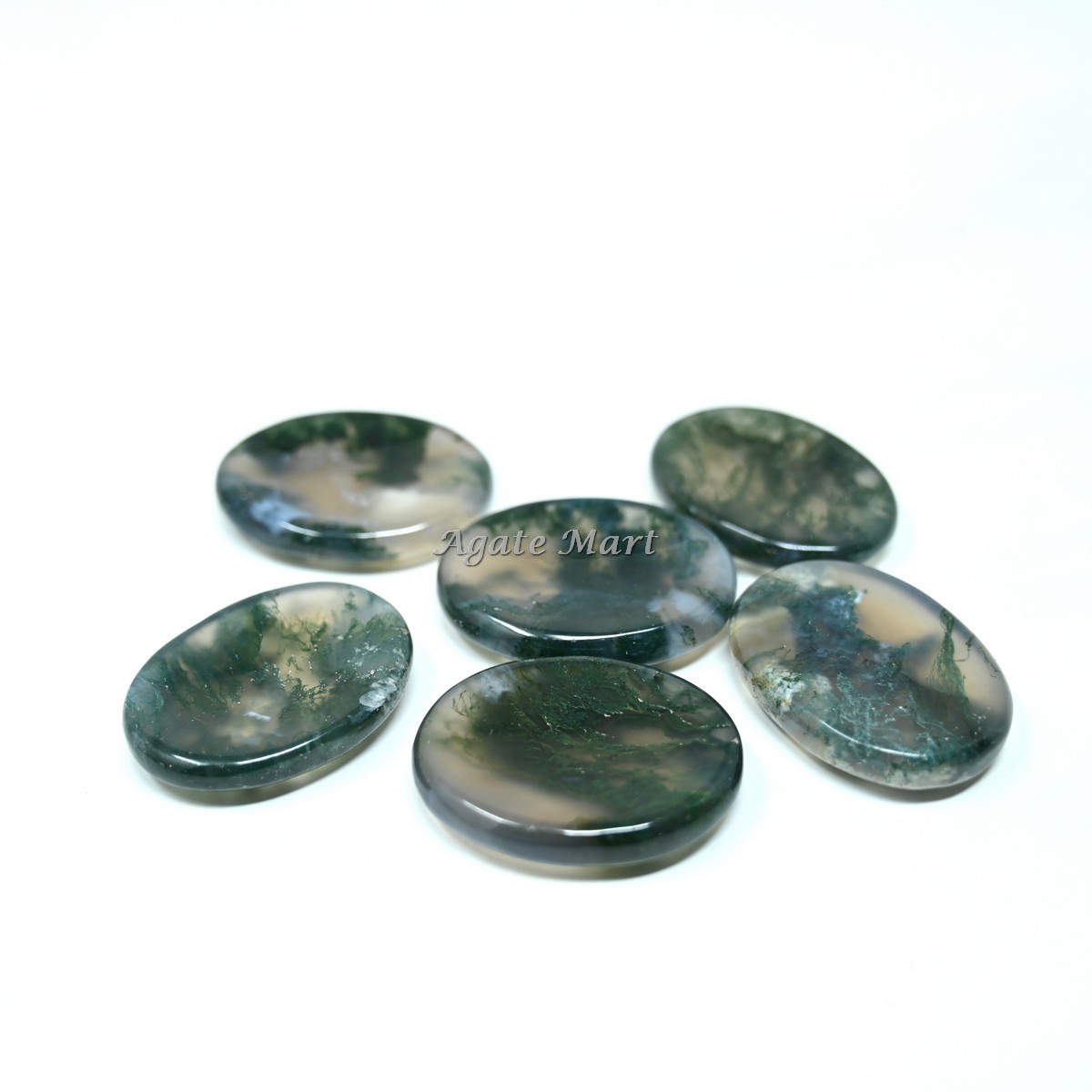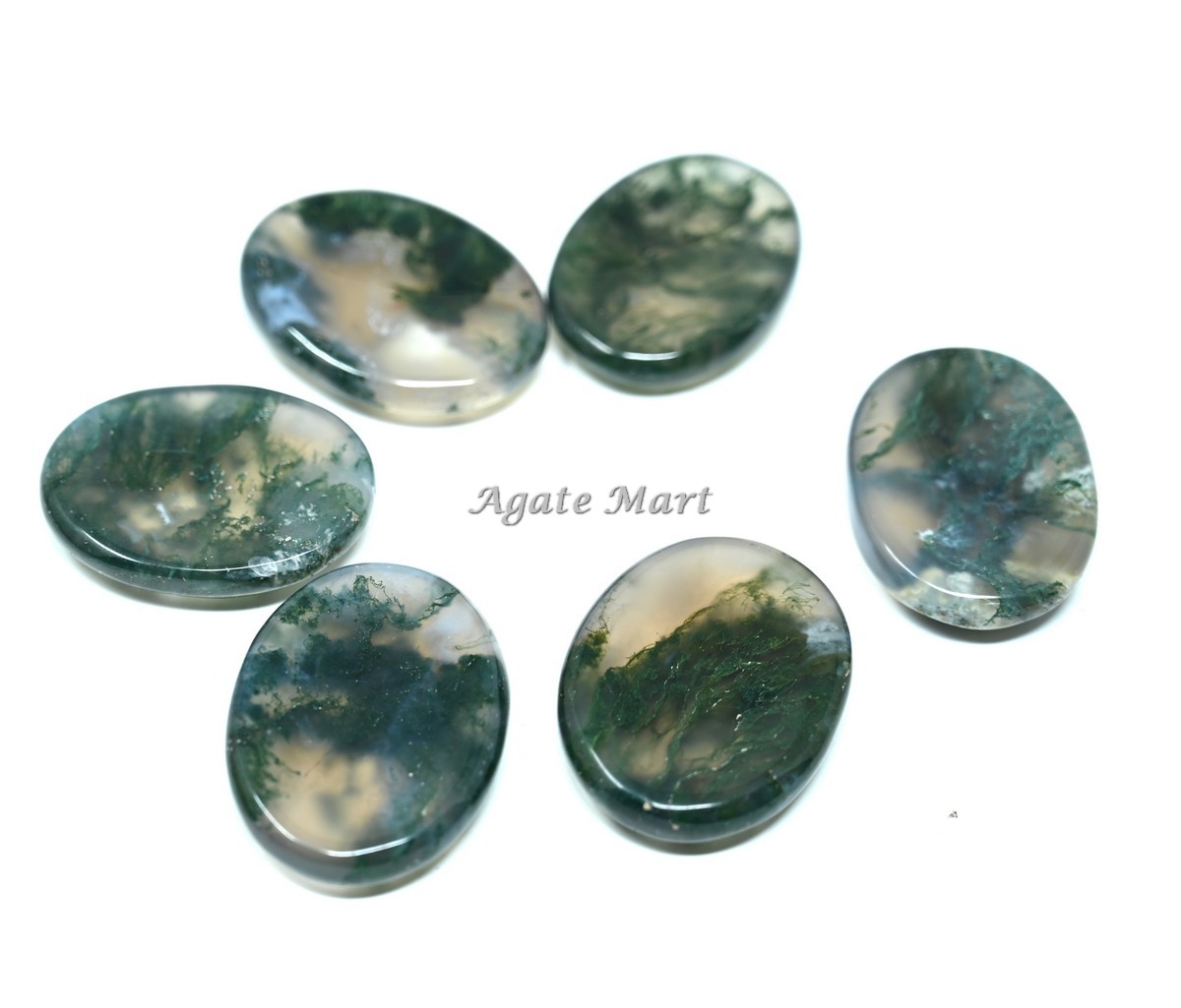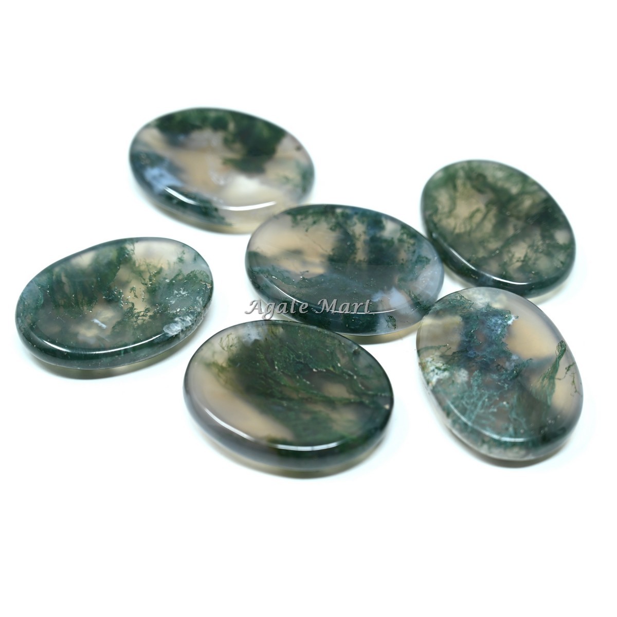 Moss agate worry stone is polished gemstone, smooth, oval with thumb pad sized indentation. This stress stone carries on the customs beginning in Ancient Greece. Hold it in your palm and rub it with your thumb to help facilitate your stresses. Greenery Agate stress stones can ground, quiets and focus. Order online now.