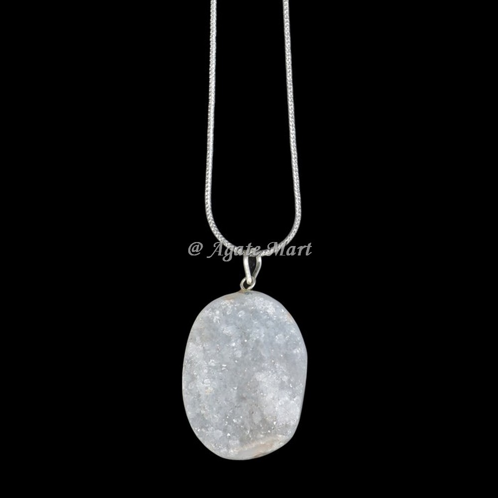 Shop Online for Oval Druzy with Silver Chain Pendant .It is also well-known as ?The Gemstone of Heaven.?Its meaning impact on the person`s body and mind helped one to get the most elevated wisdom. Most people believe that Druzy helps its user to calm down, thereby eliminating anxiety levels.Order oval Druzy with silver chain Pendant Now.