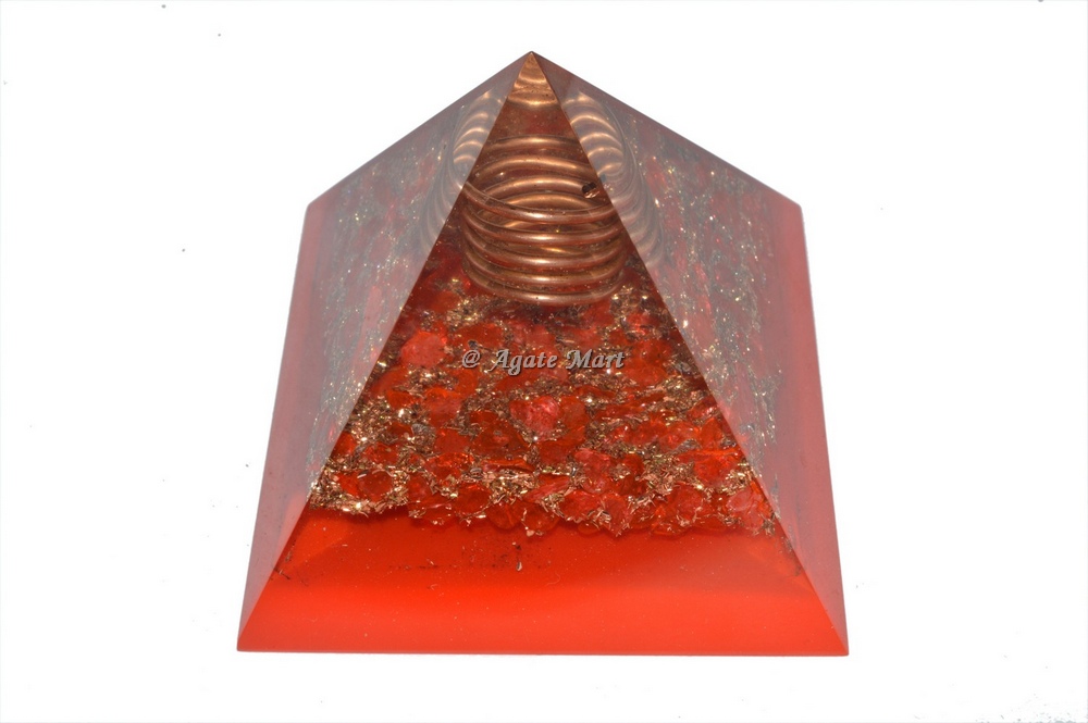 Browse online collection of Red Carnelian Orgonite Pyramid. Carnelian Stones are stones of action, that will give you the courage and confidence to move forward on a new path in life.It is strong stone to aid the physical body, as it maintains an improved flow of life force energy via the blood.The vibration of this red stone, will accelerate your motivation, and aid you to clarify your goals, so you can find your best direction in life. Orgonite is a mixture of copper shavings in organic resin. As it sets the resin contracts slightly and this enables it to attract Orgone Energy from the air.