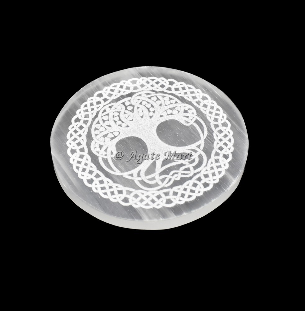 These Charging Plate are hand made and vary in size and shape slightly Etched with Tree Of Life Engraved Selenite Charging Plate polished white Selenite for cleansing and energizing your crystals & stones. An essential piece for crystal healing, gridding, Reiki, and altars. When you take off your jewelry each night, place your pieces atop your Selenite charging plate over night. Place your crystals and tumbled stones on top of it to cleanse and clear their energy. You can also use these plates to create a crystal grid, as the selenite properties will amplify the power of your grid. Selenite is a very high vibrational and powerful crystal. While it does not necessarily hold on to negative energy it would still clear and charge it. Selenite is a soft crystal so you do not ever want to use water around it since it could damage your crystal. There is a little variation as these are natural Selenite pieces and handmade. We have more shapes, etches, products, laser engraved and hand painted plates and more!