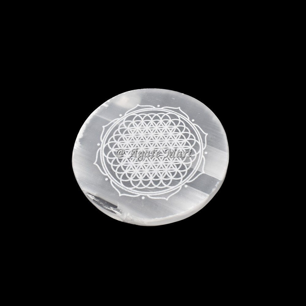 Purchase Selenite Chakra With Flower of life Charging Disk from Agate Mart. Selenite, also known as satin spar, desert rose, or gypsum flower are four crystal structure varieties of the mineral gypsum. These four varieties of gypsum may be grouped together and called selenite. These Selenite charging disks are beautiful with amazing energy. The Flower of Life provides enlightenment to those who study the symbol and its perfect form. Certain variations of the Flower of Life hold different meaning and significance. The Seed of Life is formed with seven overlapping circles that create a more singular flower design. It refers to wheels of energy throughout the body. There are seven main chakras, which align the spine, starting from the base of the spine through to the crown of the head. The seven chakra are the Root Chakra, Sacral Chakra, Solar Plexus Chakra, Heart Chakra, Throat Chakra, Third Eye Chakra and the Crown Chakra.